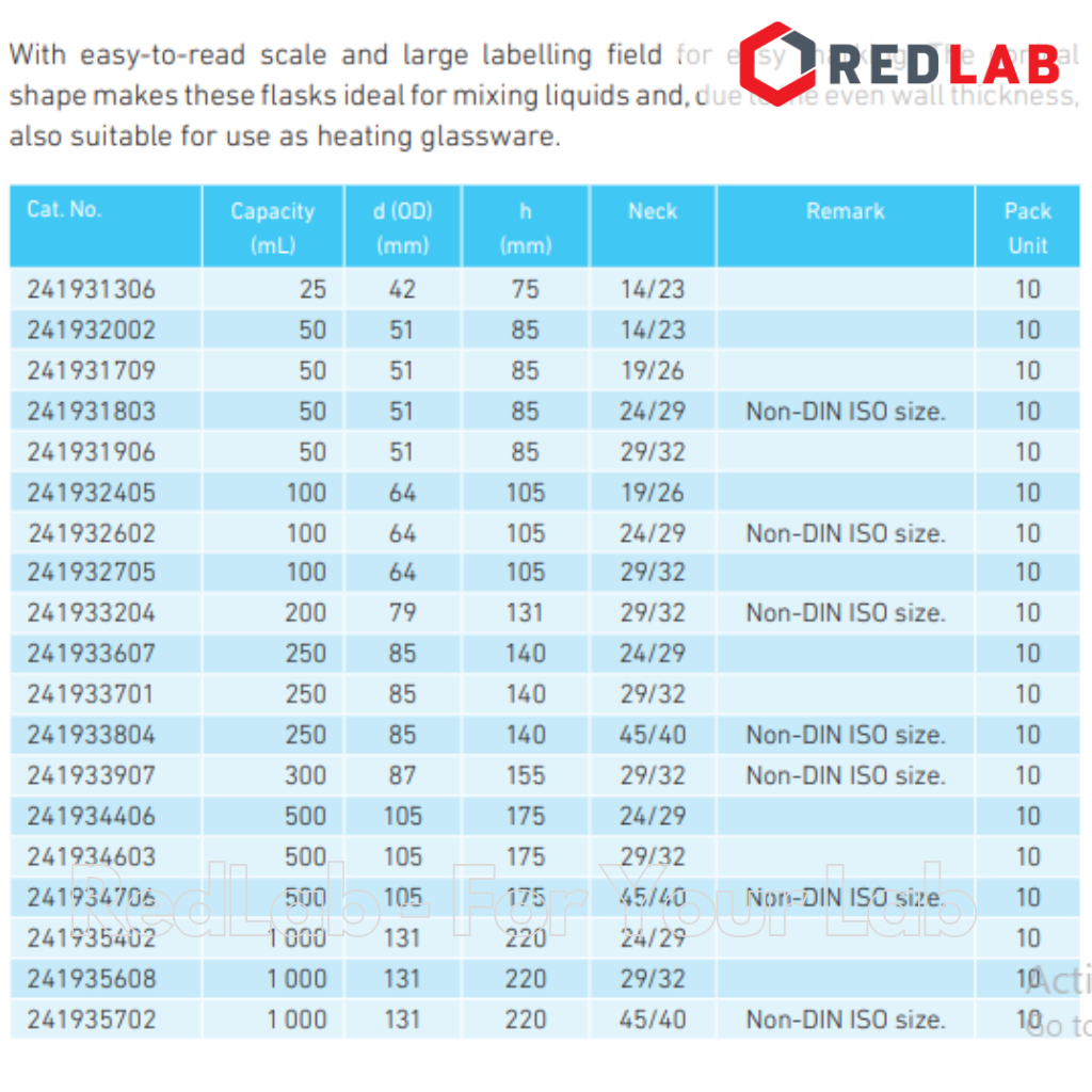 Giới thiệu về Bình tam giác cổ nhám 24/29 29/32 DURAN Class A 100 250 500 1000 ml, chưa gồm nút, Erlenmeyer with Joint