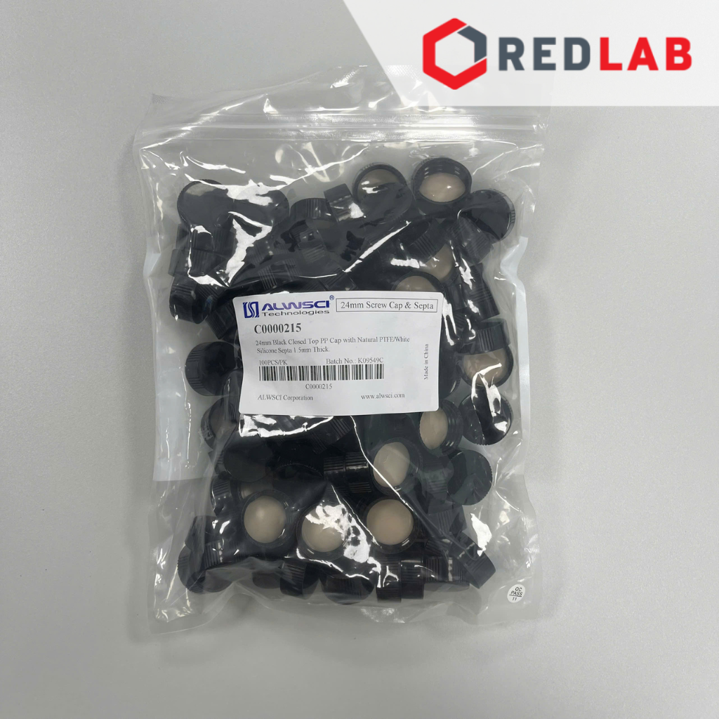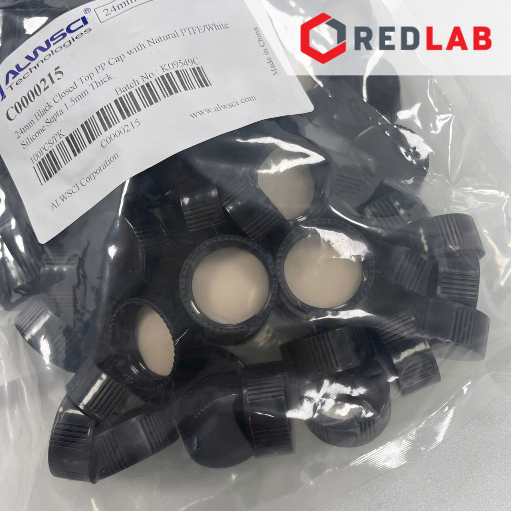 C0000058+C0000215 Chai thủy tinh Vial nâu 20ml, 27.5x57mm, hộp 100 cái + Nắp vặn kín 18-400 (màu đen, PP), Septa 1.5mm, natural PTFE / White Silicone, gói 100 cái ALWSCI