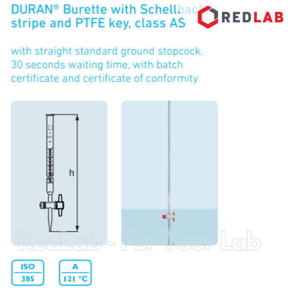 Buret trắng khóa nhựa PTFE DURAN Class AS 10 25 50 100 ml, dùng trong thí nghiệm chuẩn độ, có VAT