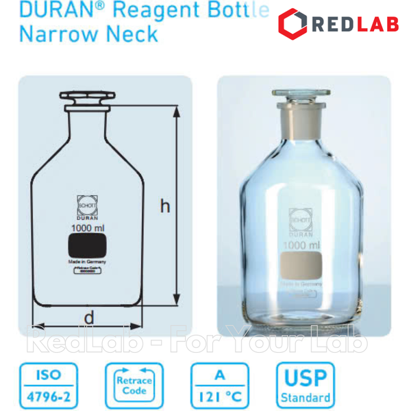 Chai trắng cổ hẹp nút mài thủy tinh DURAN 50 100 250 500 1000 200 ml - nhám 14/15 19/26 24/29 29/32, có VAT