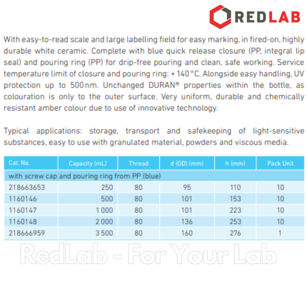 Giới thiệu về Chai trung tính nâu Miệng Rộng GLS 80 DURAN 250 500 1000 2000 ml, thuỷ tinh borosilicate 3.3, nắp nhựa PP