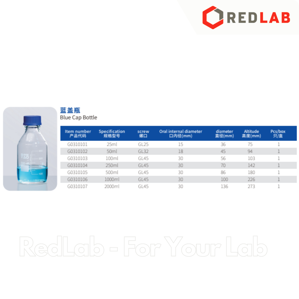 Chai trung tính trắng nắp vặn xanh GlassTAO 50 100 250 500 1000 2000 ml, đựng mẫu thí nghiệm, có VAT