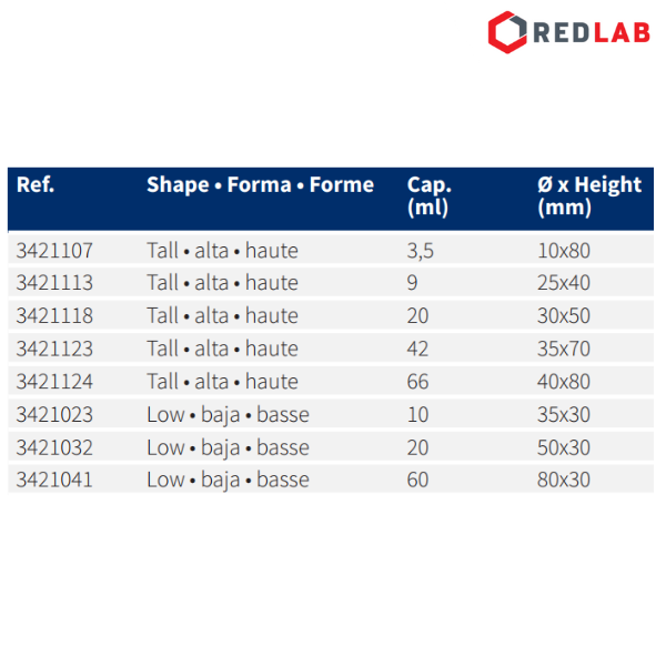 Thông tin về Chén cân đa dạng kích thước NORMAX Bồ Đào Nha 10x80 25x40 30x50 35x30 35x70 40x80 50x30 80x30 mm