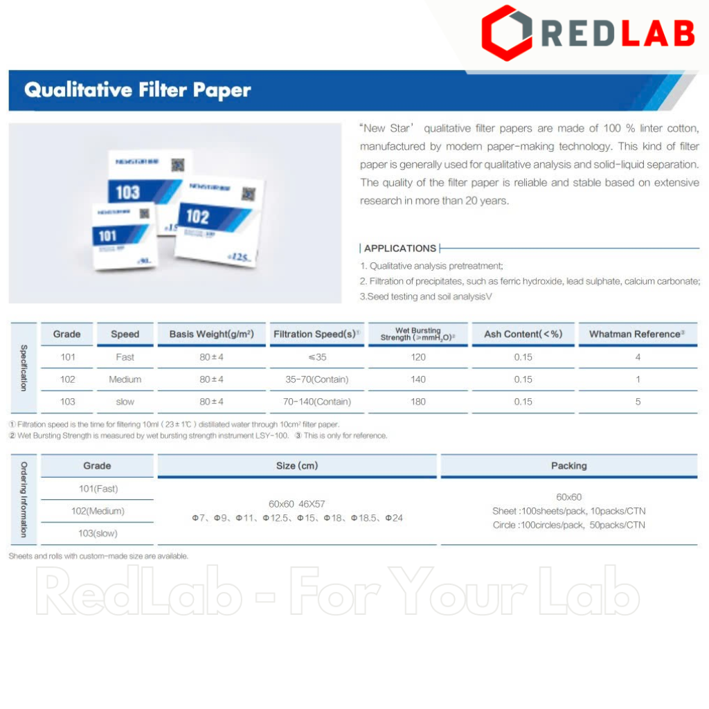 Giới thiệu về Giấy lọc định tính NewStar Ø 7 9 11 12.5 15 18 cm, loại 101 102 103, chảy nhanh / trung bình / chậm (hộp 100 tờ)