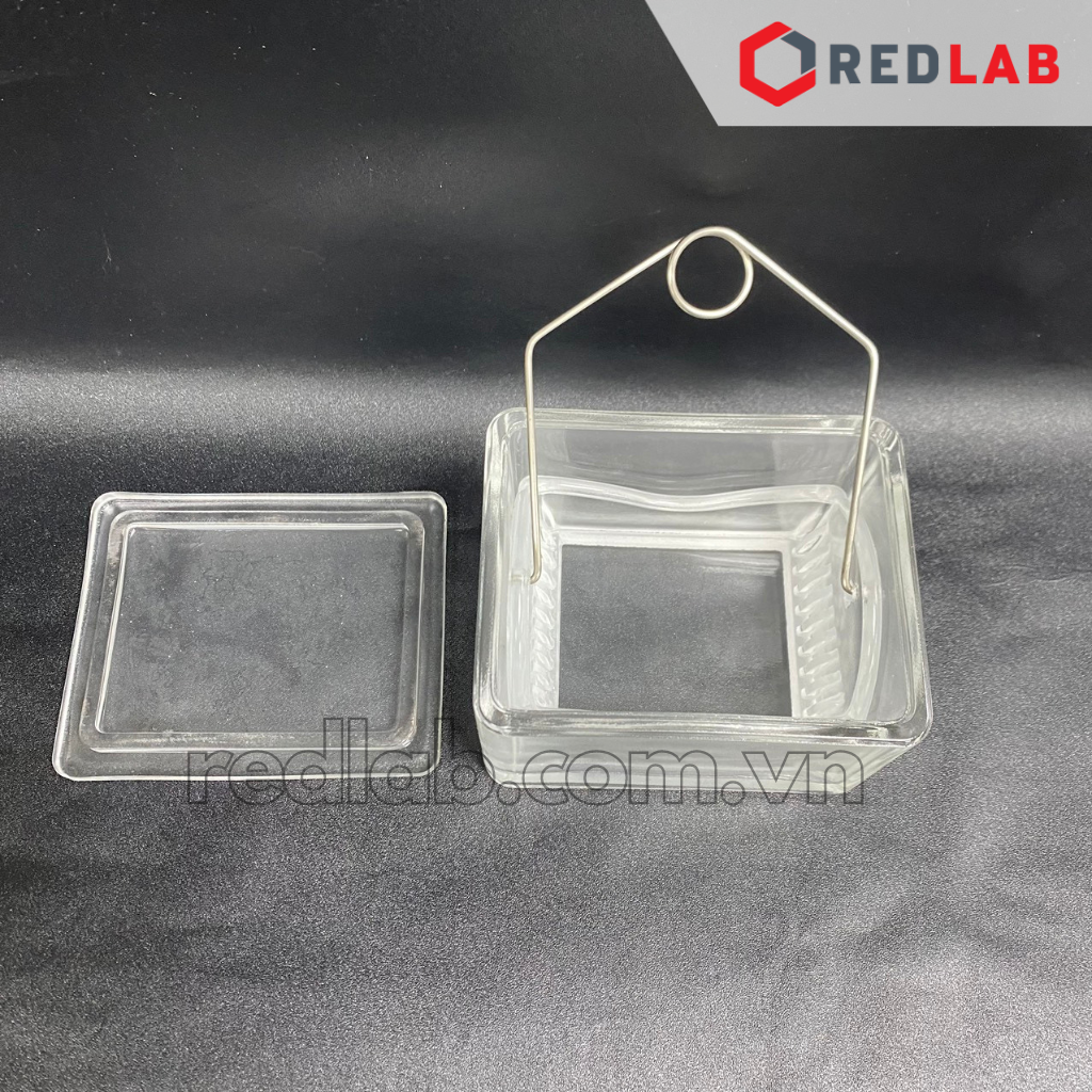- Bao gồm: hộp nhuộm (hình chữ nhật), nắp hộp nhuộm, giá nhuộm có rãnh để bỏ lam kính và tay cầm inox gắn với giá nhuộm để cầm thao tác