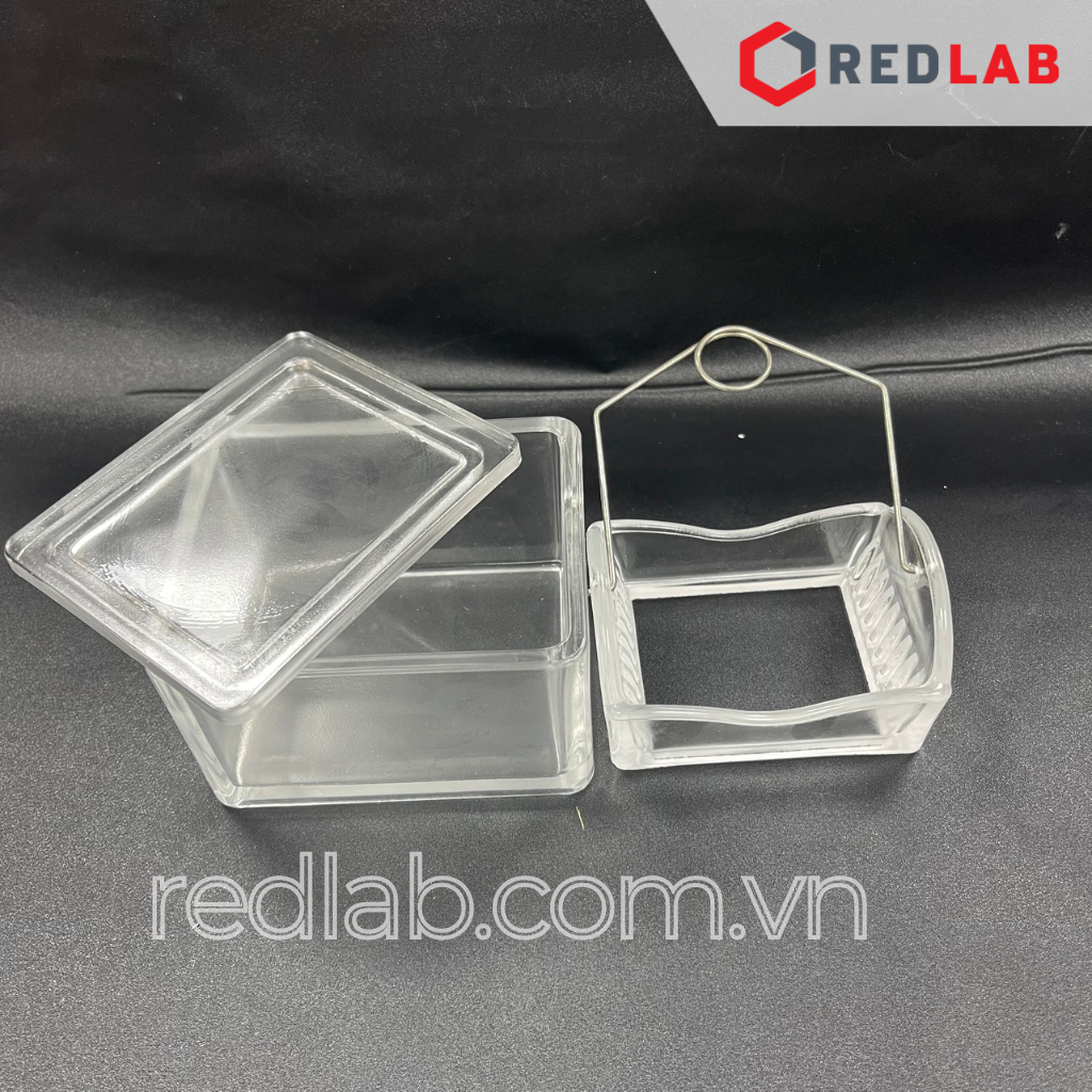 - Hộp nhuộm lam hay bể nhuộm lam ứng dụng trong nhuộm lam kính có hình chữ nhật có nắp đậy thuỷ tinh, thành dày và thuỷ tinh trong suốt.