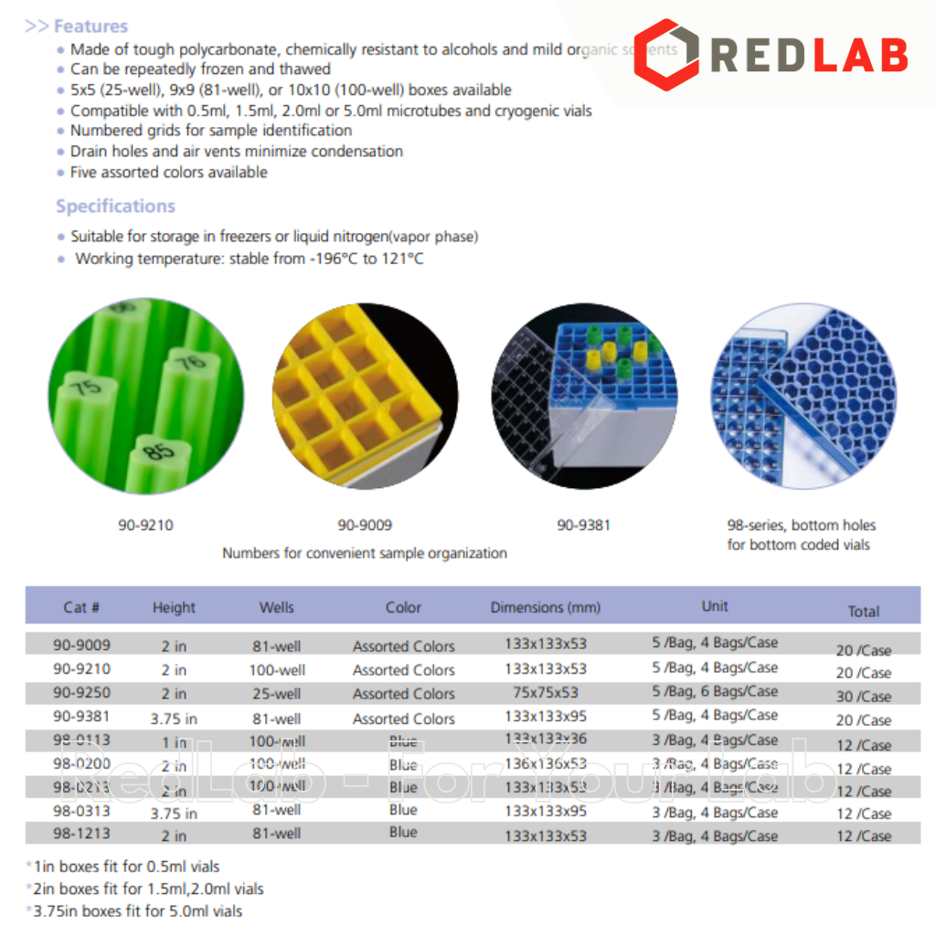 | 90-9009 | Hộp trữ lạnh 81 vị trí, nhựa Polycarbonate, chịu nhiệt -196ºC đến hấp autoclave 121ºC, lưu trữ trong tủ âm sâu hoặc trong nitơ lỏng, kích thước 133x133x53mm | BIOLOGIX |