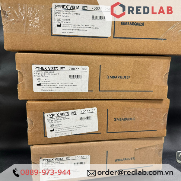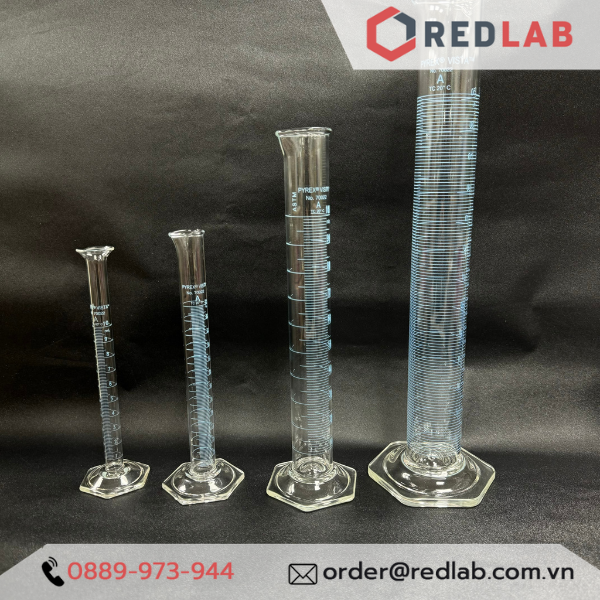 Giới thiệu Ống đong thuỷ tinh PYREX Class A 10 25 50 100 250 ml, đế lục giác chia vạch xanh, thuỷ tinh Borosilicate
