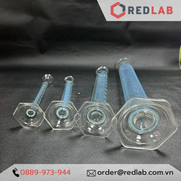 - Đặt biệt ống đong thủy tinh chia độ kép (2 dãy số: đọc xuôi trên xuống và đọc ngược dưới đáy lên), giúp đọc thể tích và xác định biến đổi thể tích dễ dàng khi thao tác.