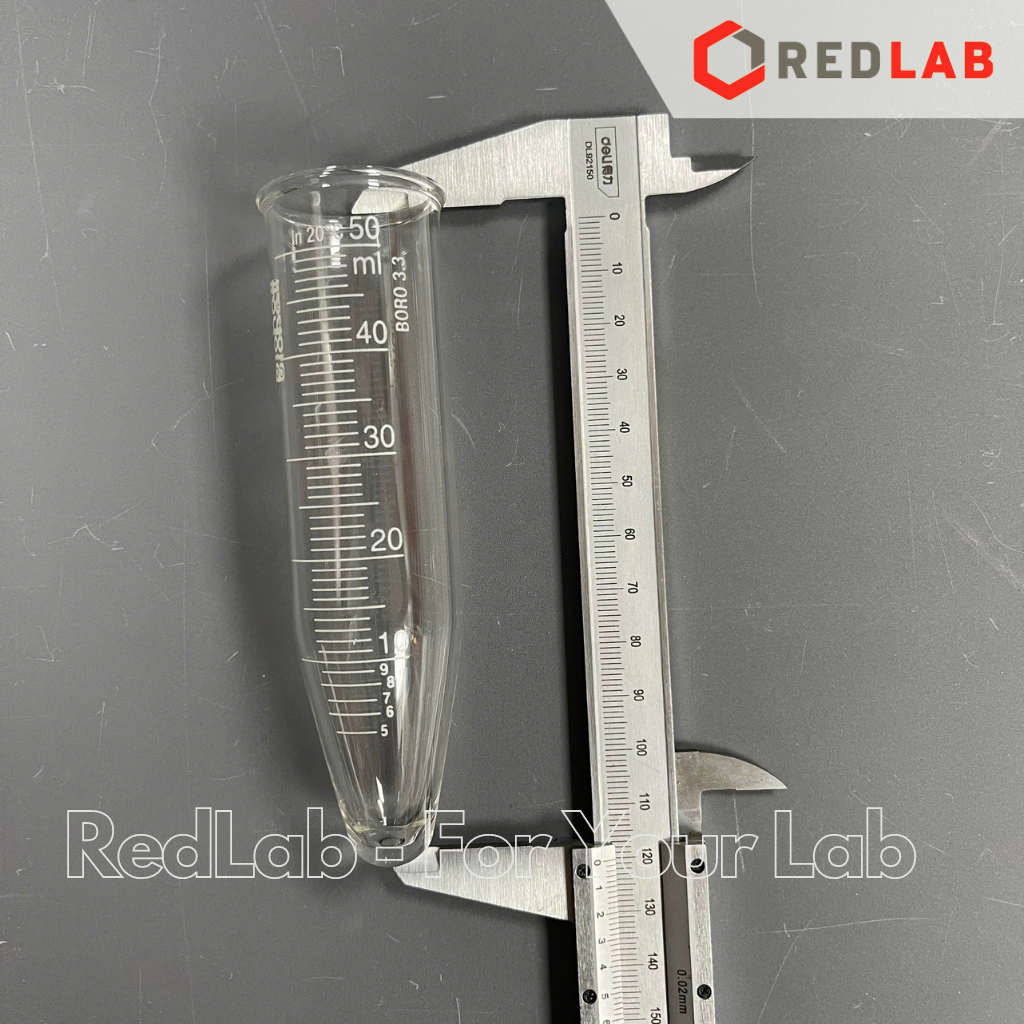 BLS.CB02.08 Ống ly tâm thủy tinh đáy nhọn 50ml - 135x29mm, chia vạch xanh BIOHALL