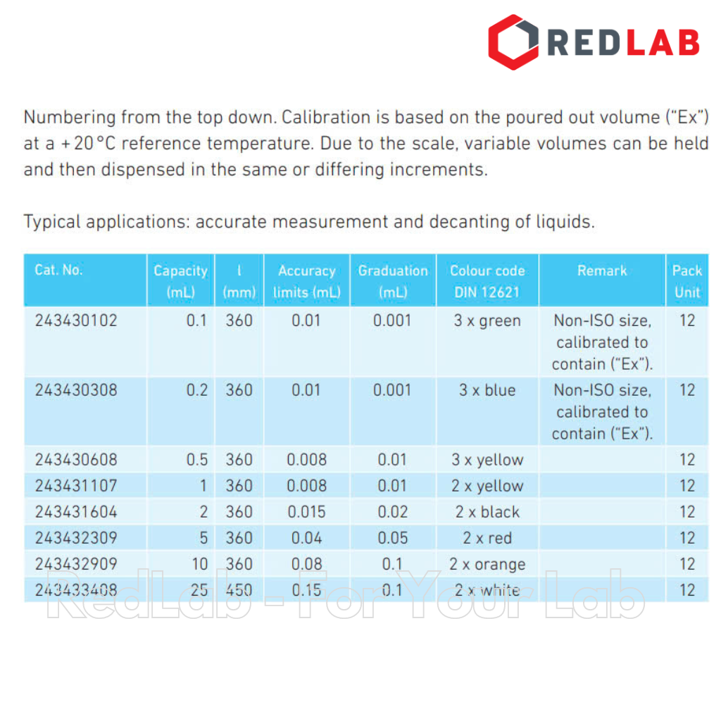 - Hiệu chuẩn với dung tích rót vào ở nhiệt độ tham chiếu +20°C