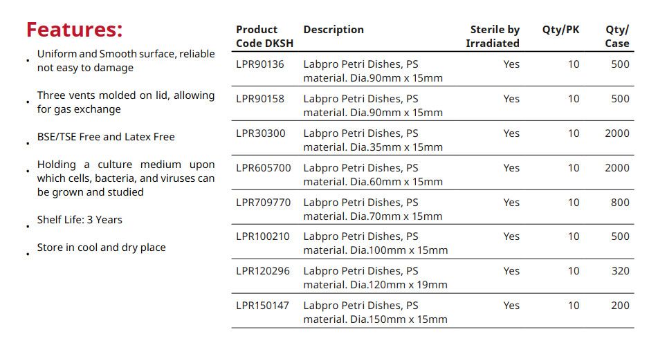 - Với thiết kế kích thước ít chênh lệch giữa nắp và đĩa nhằm hạn chế lấy nhiễm trong quá trình cấy mẫu vi sinh.